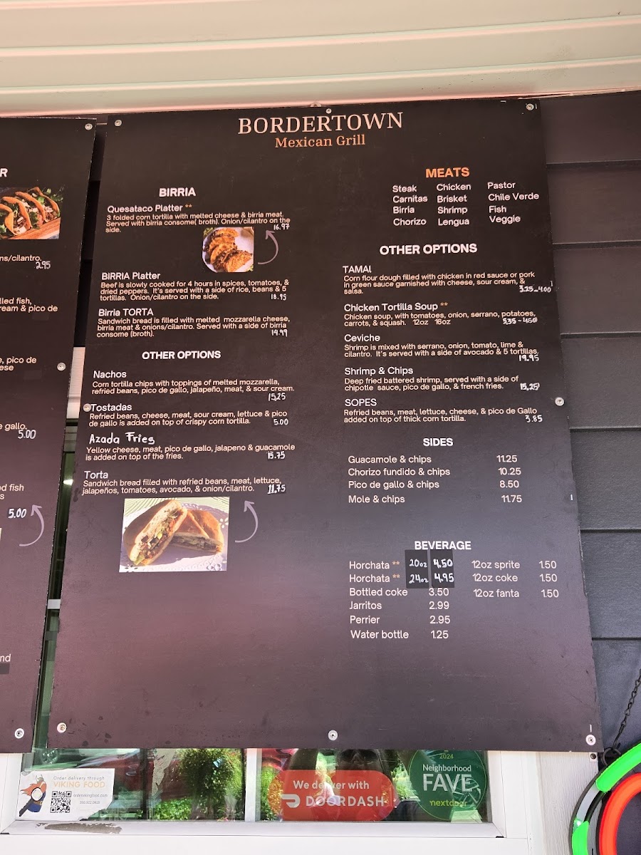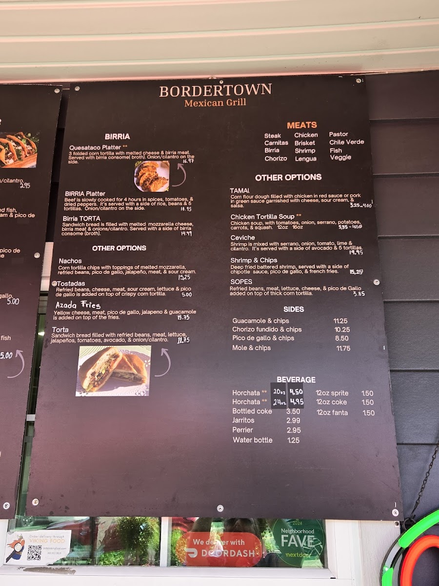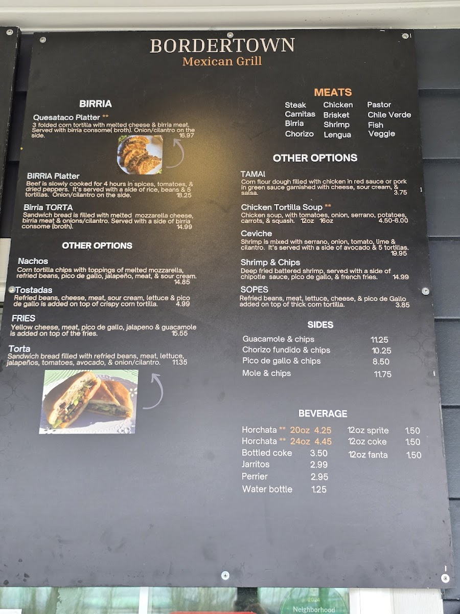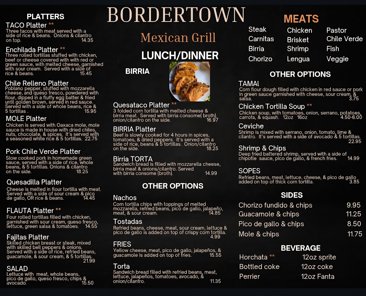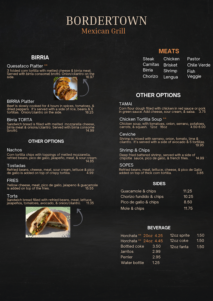 3 folded corn tortilla with melted cheese & birria meat. Served with birria consome (broth). Onion/cilantro on the side.