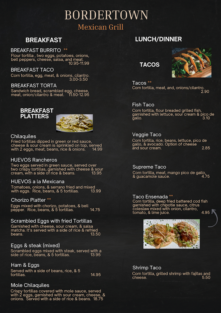Crispy tortillas covered with mole sauce, served with 2 eggs, garnished with sour cream, cheese, & onions. Served with a side of rice & beans.
