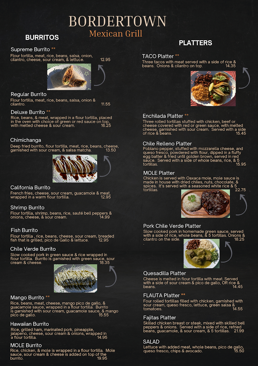 Rice, beans, meat, cheese, mango pico de gallo, & guacamole sauce, wrapped in a flour tortilla. Burrito is garnished with sour cream, guacamole sauce, & mango pico de gallo.