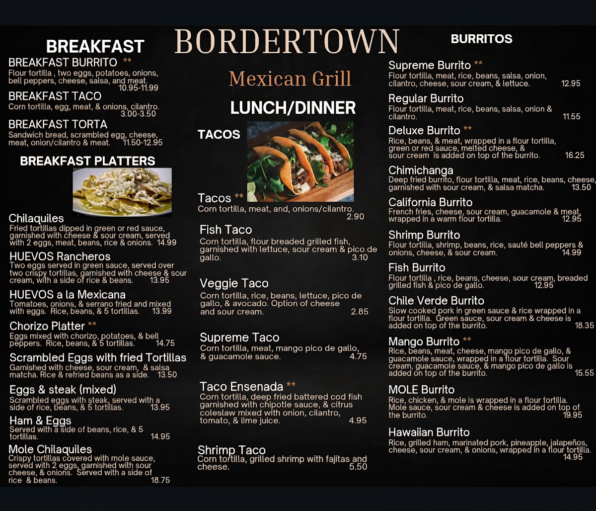 Flour tortilla, shrimp, beans, rice, sauté bell peppers & onions, cheese, & sour cream.